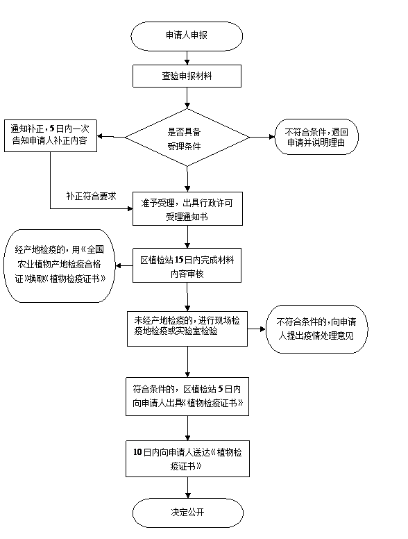 办理环节:区植检站受理窗口经办人员进行书面形式审查,区植检站专职检疫员对申请材料进行审核,如需对调运植物或植物产品及相关设施进行现场检疫的,派2名以上专职检疫员按《农业植物调运检疫规程》进行现场检疫后作出行政许可决定。