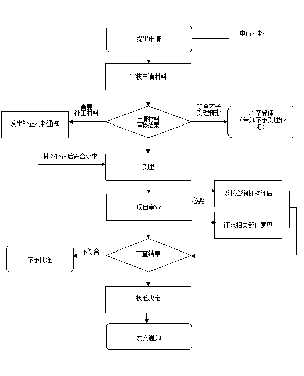 (1)办理环节:申请人现场提交申请材料,对申请项目属于核准范围、申请材料齐全、符合规定形式的,或者项目申报单位按要求提交全部补正申请材料的,办理机构根据需要委托有资质的咨询机构进行评估论证,在对项目进行审查后,做出是否核准的决定。投资管理服务中心根据决定送达决定文书。对不予核准的项目,应同时说明不予核准理由。