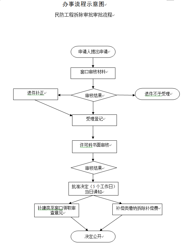 (1)办理环节:申请单位至民防窗口现场提交申请材料,窗口工作对提供申请材料齐全、符合规定形式的,递交办内行政许可科负责人;申请材料不齐全、不符合规定形式的,退回申请单位予以补正。行政许可科负责人依据职能分工指派相关审批人员进行审批,审批批复由民防窗口进行发放。