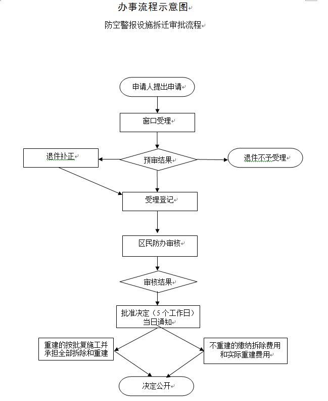 因城市建设需要,改建、拆除建筑物、构筑物时,需要防空警报设施的,拆除单位应当提出申请并将建设工程规划许可证或者房屋拆迁许可证等材料报送防空警报设施所在地的区、县民防办。区、县民防办应当在接到申请材料后的3个工作日内,将相关材料报送市民防办审批;市民防办应当自收到相关材料之日起15个工作日内作出审批决定。