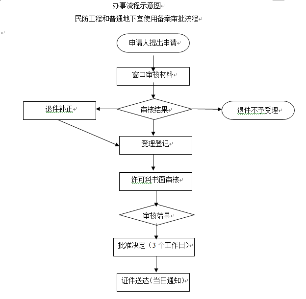 (1)办理环节:申请单位至民防窗口现场提交申请材料,窗口工作对提供申请材料齐全、符合规定形式的,递交办内行政许可科负责人;申请材料不齐全、不符合规定形式的,退回申请单位予以补正。行政许可科负责人依据职能分工指派相关审批人员进行审批,审批批复由民防窗口进行发放。
