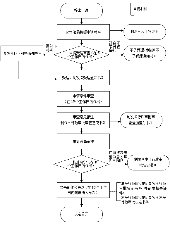 (二)办理期限:区司法局审查15个工作日,市司法局审核8个工作日;