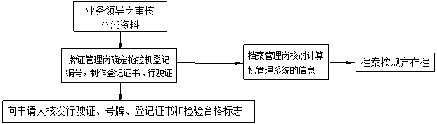 办理环节:登记受理岗审查拖拉机、联合收割机所有人提交的材料,经书面审查符合条件的,受理申请。牌证管理岗按照《拖拉机、联合收割机登记工作规范》规定在计算机管理系统中录入相关信息,业务领导岗审核全部资料后作出行政许可决定。